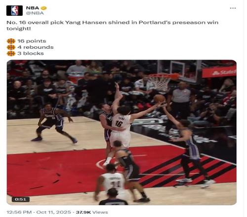 雷速体育10月11日宣 NBA季前赛继续进行开拓者124-123击败了国王,中国球员杨瀚森第三节单节5投全中得到了14分,全场比赛8投5中拿到了16分4个篮板3次盖帽,赛后NBA官推发布了杨瀚森的比赛集锦,大量球迷发布评论感叹杨瀚森表现出色。
