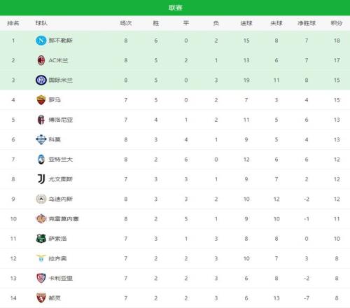 意甲第8轮战焦点大战,那不勒斯对阵国际米兰的榜首之争,谁全取3分谁登顶,结果在欧冠2-6大败的意甲卫冕冠军笑到最后,3-1力克国米,领跑积分榜;帕尔马0-0战平科莫;亚特兰大客场被克雷莫内塞1-1逼平,英超名将瓦尔迪破门建功。