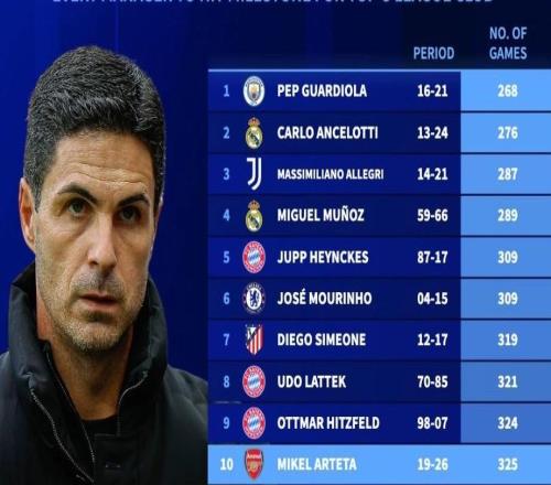 五大联赛俱乐部最快200胜主帅:瓜帅第1,阿尔特塔325场第10 -