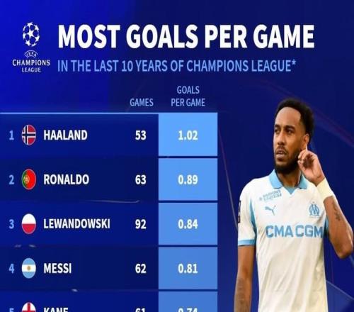 近10年欧冠场均进球榜:哈兰德1.02球第1,C罗第2,梅西第4 -